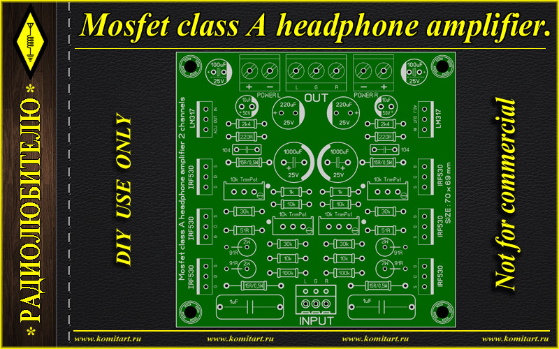 Mosfet class A headphone amplifier komitart projectMosfet class A headphone amplifier. Принципиальная схема усилителя для наушников. 2 варианта плат LAY6 формата. Список элементов.