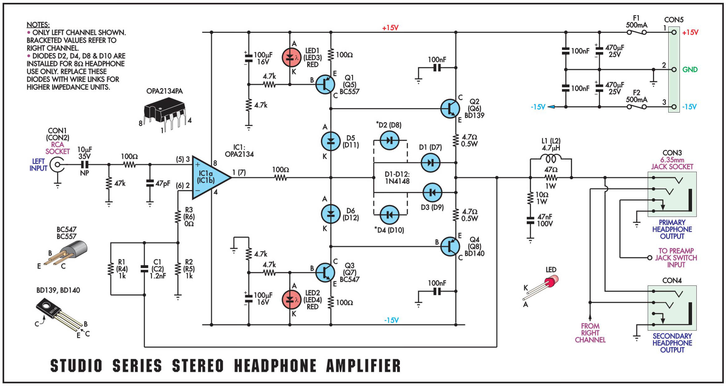 Приветствую, друзья. Так уж получилось, что у нас уже выходила пара статей по данному проекту, ссылки на эти статьи ниже: В связи с тем, что данный усилитель отмечен высокой повторяемостью и отличным звучанием, мы решили сделать свой вариант печатной платы с гораздо меньшими габаритами. Напомню принципиальную схему: Что нам пишут друзья - Никаких заморочек, сборка без танцев с бубном, звук хорош, как и хвалили в комментариях и на некоторых сторонних форумах, по верхам и низам всего хватает, включается и выключается практически бесшумно. Потребление одного канала 95 mA, второго точь в точь 95 mA, всё ровно. Радиаторы горячие, но не критично. Максимальная мощность на нагрузку 32 R — 780 mW получилось. R3 и R6 — 2,2k поставил. Сигнал от внешней звуковой карты брал, компом и регулирую громкость. Плата односторонняя, новый размер 82 x 85 mm, компоновка элементов на плате стала такая: Данная плата опробована в железе, ниже показаны некоторые замеры: Список элементов Studio series headphone amplifier NEW PCB: - IC1 - OPA2134 - 1 шт. - Q1, Q5 - BC557 - 2 шт. - Q2, Q6 - BD139 - 2 шт. - Q3, Q7 - BC547 - 2 шт. - Q4, Q8 - BD140 - 2 шт. - D1 ... D4, D7...D10 - 1N4148 - 8 шт. - D5, D6, D11, D12 - Светодиоды 5mm красные - 4 шт. - 47k/0,25W - 2 шт. - 100R/0,25W - 8 шт. - 1k/0,25W - 4 шт. - 4k7/0,25W - 8 шт. - 4R7/0,5W - 4 шт. - 10R/1W - 2 шт. - 47R/1W - 2 шт. - 10uF/35V NP - 2 шт. - 1n2/50V MKT polyester - 2 шт. - 47pF керамика - 2 шт. - 100uF/16V - 4 шт. - 470uF/25V - 2 шт. - 100n/50V MKT polyester - 6 шт. - 47n/100V polyester - 2 шт. - Радиаторы для выходных транзисторов - 4 шт. - Панелька 8 Pin для IC1 - 1 шт. - L1, L2 - Катушки 4,7uH (21 виток провода диаметром 0,6 mm на оправку диаметром 10 mm) - 2 шт. В архиве : Оригинальная статья из журнала "Everyday Practical Electronics. March 2008", принципиальная схема, печатная плата LAY6 формата, сопутствующие фото и изображения. Удачного повторения. Размер архива - 5,1 Mb.