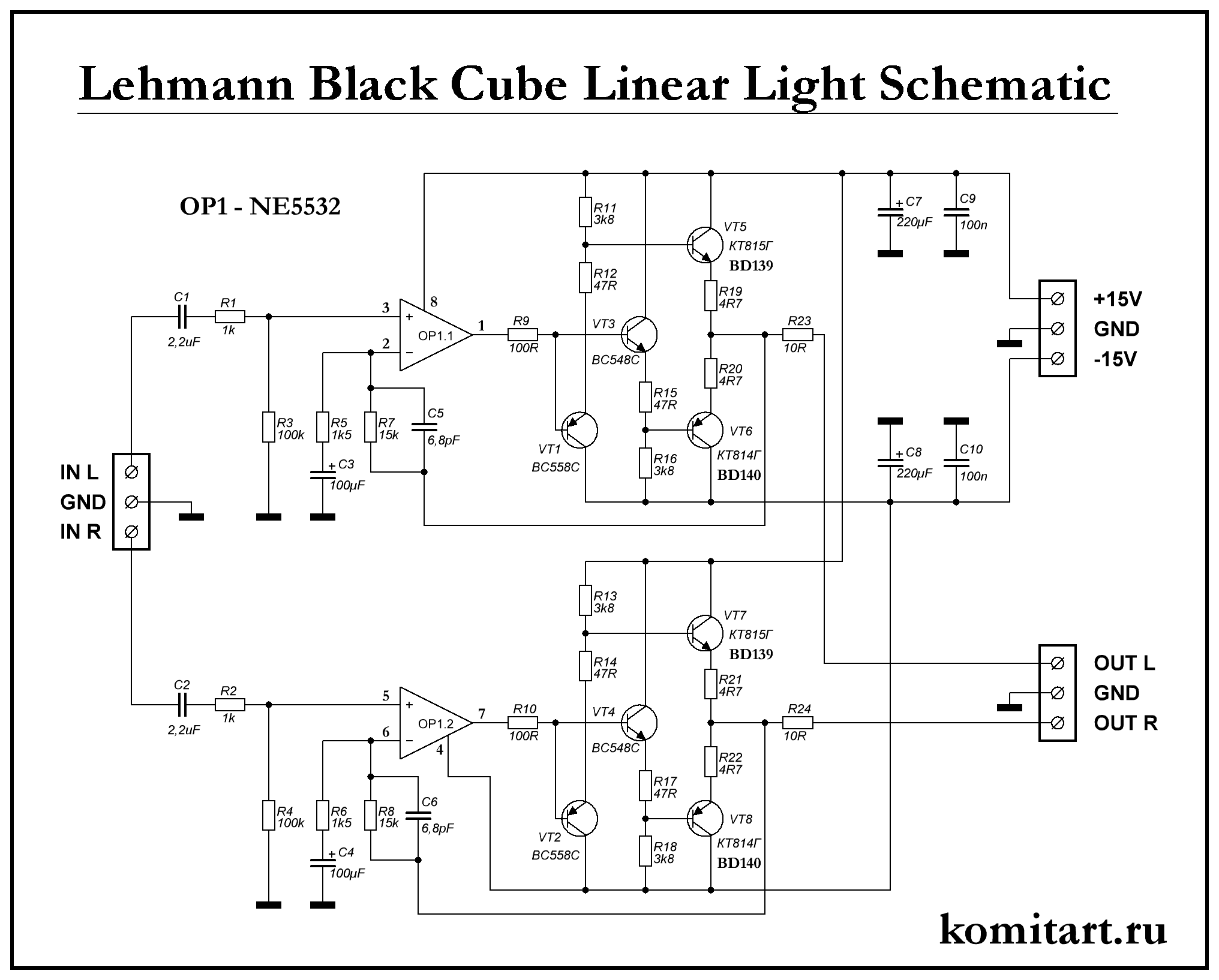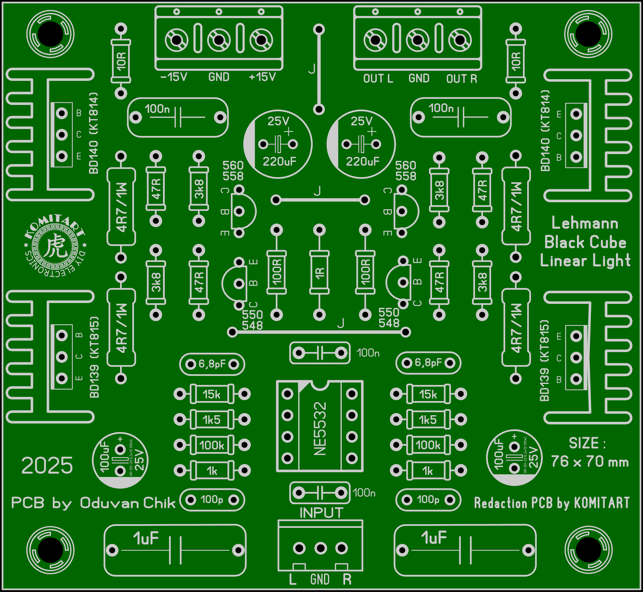 Приветствую, друзья. Сегодня у нас на повестке дня очередной усилитель для наушников с односторонней версией печатной платы Lehmann Black Cube Linear Light HPA v2. Первая версия усилителя с двухсторонней печатной платой находится по ссылке ниже: Обращу внимание, в предыдущей версии обратной связью охвачен только операционный усилитель, в этой версии ООС взята непосредственно с выхода усилителя. Коэффициент усиления можно прикинуть по формуле : Кус=(1+R4/R3). Ниже показана принципиальная схема: Как я уже написал выше, плата в этом проекте односторонняя, размер 76 x 70 mm, компоновка элементов показана ниже: По поводу блока питания, мы не стали на одной плате с усилителем размещать элементы БП, потому что у многих предпочтения разнятся, кому то 7815/7915 достаточно, кто то предпочитает источники на LM317/LM337, у кого то ещё более жесткие требования, проектов PSU подходящих для этого усилителя на сайте много, поэтому не поленитесь заглянуть в соответствующий раздел сайта и выбрать наиболее приглянувшийся. С операционным усилителем можете поэкспериментировать, поэтому заранее впаяйте в плату панельку DIP-8. Список элементов Lehmann Black Cube Linear Light HPA v2: - OP1 - NE5532 - 1 шт. - R1, R2 - 1k/0,25W - 2 шт. - R3, R4 - 100k/0,25W - 2 шт. - R5, R6 - 1k5/0,25W - 2 шт. - R7, R8 - 15k/0,25W - 2 шт. - R9, R10 - 100R/0,25W - 2 шт. - R11, R13, R16, R18 - 3k8/0,25W - 4 шт. - R12, R14, R15, R17 - 47R/0,25W - 4 шт. - R19, R20, R21, R22 - 4R7/1W - 4 шт. - R23, R24 - 10R/0,25W - 2 шт. - C1, C2 - 2,2uF NP - 2 шт. - C3, C4 - 100uF/25V электролит - 2 шт. - C5, C6 - 6,8pF/50V керамика - 2 шт. (можно поставить по 15pF) - C7, C8 - 220uF/25V электролит - 2 шт. - C9, C10 - 100n/50V - 4 шт. - Радиаторы для BD139/BD140 - 4 шт. - Панелька DIP-8 для OP1 - 1 шт. - Разъем 3 Pin 2,54 mm (INPUT) - 1 шт. - Разъем 3 Pin 5 mm (OUTPUT, POWER) - 2 шт. Плата собрана, сделаны некоторые замеры: Удачного повторения. Размер архива - 3,1 Mb.