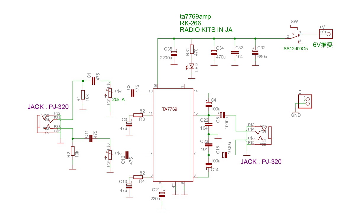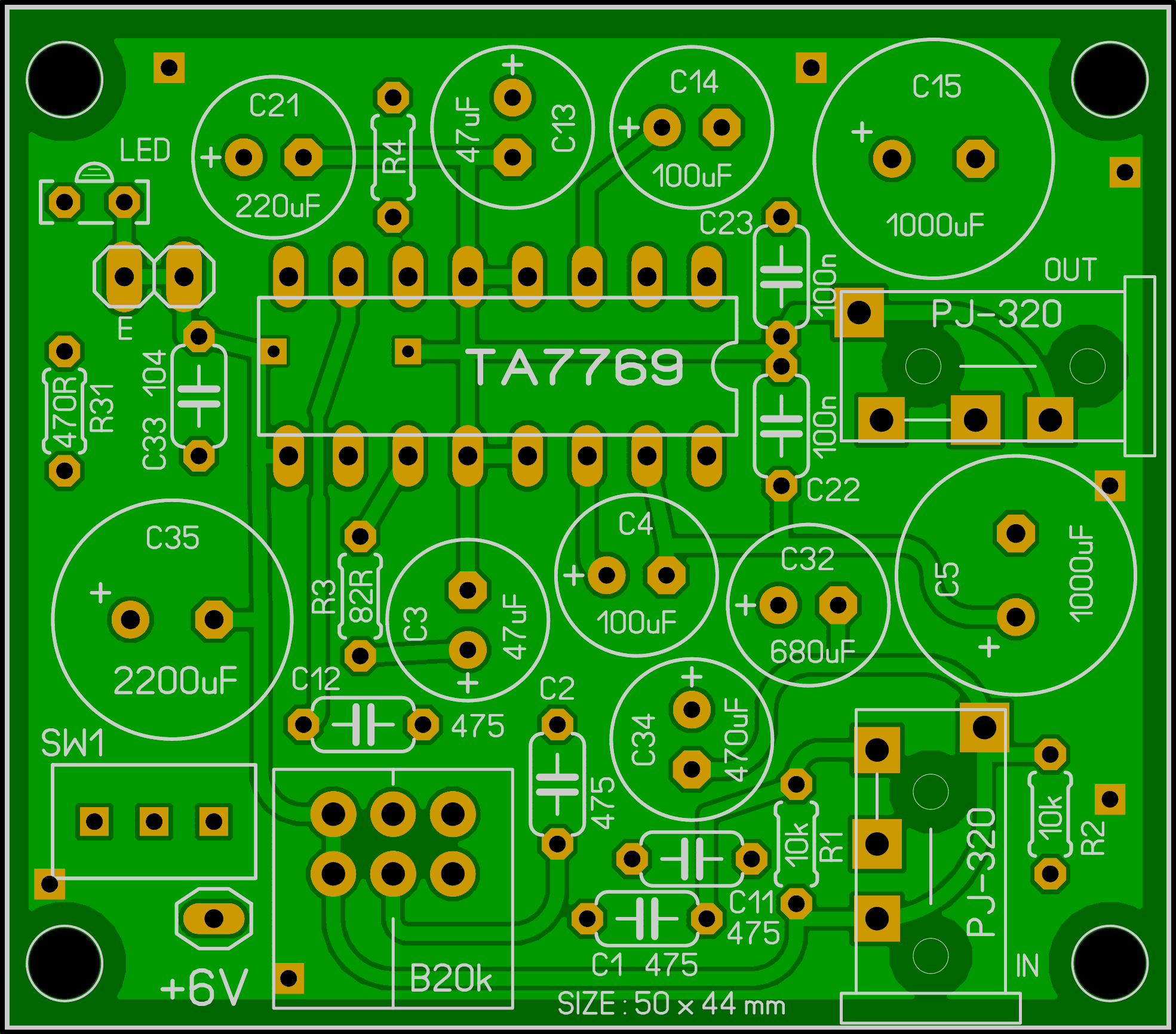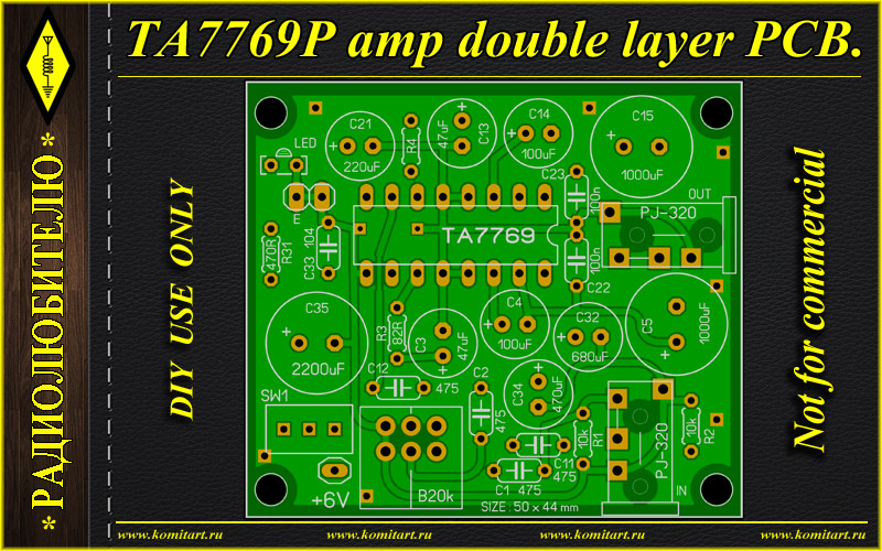 Приветствую, друзья. В этой статье содержится материал для сборки простенького маломощного усилителя на микросхеме TA7769P от Toshiba. Запитать усилитель можно от четырех батареек формата AAA. Данный проект является копией зарубежного конструктора для самостоятельной сборки, название конструктора "TA7769amp RK-266 Radio Kits". При напряжении питания 6 Вольт на нагрузку сопротивлением 4 Ома мы получим мощность 1 Ватт, остальные параметры посмотрите в файле "TA7769P datasheet", который будет находиться в архиве вместе с остальными материалами. Принципиальная схема усилителя показана ниже: Как я уже написал выше, плата формата LAY6 это копия двухсторонней платы из конструктора, размер 50 x 44 mm, на плате установлены входной и выходной разъёмы типа PJ-320-4P jack 3.5мм стерео, переменный резистор регулировки громкости типа ALPS RK09, двухпозиционный микропереключатель с расстоянием между выводами 2,54 mm, под микросхему ставьте панельку DIP-16, в остальном должно быть всё понятно, на плату нанёс все необходимые надписи, нумерация элементов проставлена согласно принципиальной схемы. Компоновка элементов на плате такая: В настройках усилитель не нуждается, если при сборке не накосячили, заработает сразу после включения, и не забудьте перед включением отмыть флюс, зачастую именно эта банальная ошибка является причиной того, что схема не запустилась. Список элементов: - IC1 - TA7769P - 1 шт. - LED - светодиод 3V 2*3*4mm - 1 шт. - R1, R2 - 10k / 0,25W - 2 шт. - R3, R4 - 82R / 0,25W - 2 шт. - R31 - 470R / 0,25W - 2 шт. - VR1 - переменный резистор ALPS RK09 B20k - 1 шт. - C1, C2, C11, C12 - Monolithic 475 (4,7uF) - 4 шт. - C3, C13 - 47uF/10V электролит - 2 шт. - C4, C14 - 100uF/10V электролит - 2 шт. - C5, C15 - 1000uF/10V электролит - 2 шт. - C21 - 220uF/10V электролит - 1 шт. - C22, C23, C33 -100nF/50V (104) - 3 шт. - C32 - 680uF/10V электролит - 1 шт. - C34 - 470uF/10V электролит - 1 шт. - C35 - 2200uF/10V электролит - 1 шт. - Разъём PJ-320-4P - 2 шт. - SW - микропереключатель двухпозиционный - 1 шт. (если не нужен поставьте перемычку) Собранная плата выглядит так: Удачной сборки. Размер архива - 1,3 Mb.