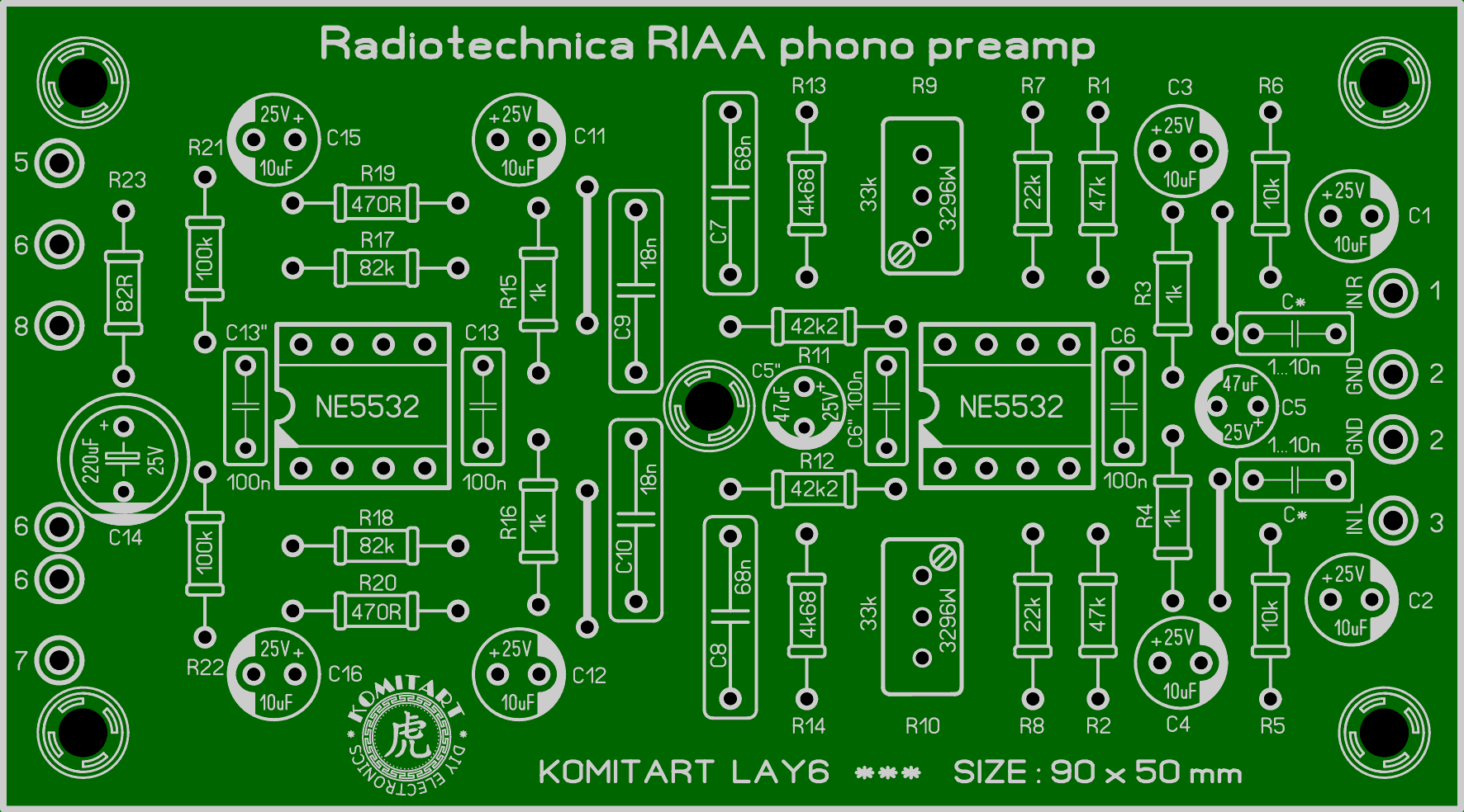 Приветствую, друзья. Попалась мне в сети статья А.Ковалева из г.Тюмени, датированная ноябрём 2003 года, о замене RIAA корректора УП-32 рижского объединения "Радиотехника", построенного на микросхеме К548УН1, на корректор, построенный на импорте, за основу он взял схему с двумя неинвертирующими каскадами усиления и пассивной цепочкой коррекции АЧХ между ними. Принципиальная схема нового RIAA преампа показана ниже: Так же в статье была картинка предлагаемой разводки печатной платы, по которой я и воспроизвел плату в формате LAY6. Плата односторонняя, размер 90 x 50 mm, компоновка элементов такая: Как пишет автор, нумерация клемм на новой плате такая же как и на плате УП-32, поэтому замена не составит большого труда. В тот же файл LAY6 формата я добавил второй вариант печатной платы, на ней вместо обычного подстроечного резистора я поставил макрос подстроечного резистора многооборотного, эта вкладка так и называется "with 3296W", выглядит плата так: К деталям, используемым в предусилителе-корректоре, особенных требований нет, за исключением того, что элементы цепочки коррекции АЧХ должны быть повышенной точности. Конденсаторы C7, C8 - К73-17, С9, С10 - К73-9. Можно применить импортные пленочные. Крайне нежелательно применение керамических конденсаторов. Электролитические конденсаторы С1-С4, С11, С12 необходимо отобрать по минимальному току утечки. Желательно, чтобы ток утечки C1 и C2 не превышал 1 мкА при приложении к ним полного рабочего напряжения. Операционные усилители DA1 и DA2 могут быть любыми сдвоенными (т.е. два ОУ в одном корпусе типа DIP8), хотя желательно использовать малошумящие и с низким уровнем искажений. Хорошо показали себя NE5532, OPA2604, MC33078. Также отлично, хотя и несколько шумнее, работают TL072, TL082 и даже LM1458, неплохо зарекомендовали себя NJM2068 (хотя у нас их достаточно трудно найти в корпусе DIP8 - чаще встречаются в корпусе DIL8 или DIL9, где все выводы расположены в одну линию - для их использования придется переразводить печатную плату). Если есть сомнения в выборе ОУ для, рекомендую на плату установить панельки, чтобы иметь возможность оперативно производить замены ОУ при их подборе. Налаживания предусилитель-корректор, собранный из исправных деталей, не требует, за исключением подстройки необходимого уровня усиления каналов - эту процедуру лучше всего производить при помощи специальной измерительной пластинки, выбрав для этого трек с номинальным уровнем записи, но можно обойтись и просто воспроизведением монофонической записи, установив одинаковый уровень сигнала на выходах обоих каналов. Список элементов Radiotechnica RIAA phono preamplifier: - DA1, DA2 - NE5532 - 2 шт. - R1, R2 - 47k / 0,25W - 2 шт. - R3, R4, R15, R16 - 1k / 0,25W - 4 шт. - R5, R6 - 10k / 0,25W - 2 шт. - R7, R8 - 22k / 0,25W - 2 шт. - R9, R10 - TrimPot 3296W 33k - 2 шт. - R11, R12 - 42k2 / 0,25W - 2 шт. - R13, R14 - 4k68 / 0,25W - 2 шт. - R17, R18 - 82k / 0,25W - 2 шт. - R19, R20 - 470R / 0,25W - 2 шт. - R21, R22 - 100k / 0,25W - 2 шт. - R23 - 82R / 0,25W - 1 шт. - C* - 1...10n / 50V - 2 шт. - C1, C2, C3, C4, C11, C12, C15, C16 - 10uF / 25V электролит - 8 шт. - C5, C5"- 47uF / 25V электролит - 2 шт. - C6, C6", C13, C13" - 100n / 50V - 4 шт. - C7, C8 - 68n / 50V...100V - 2 шт. - C9, C10 - 18n / 50V...100V - 2 шт. - C14- 220uF / 25V электролит - 1 шт. - Панельки DIP-8 - 2 шт. Удачной сборки. Размер архива - 1,3 Mb.