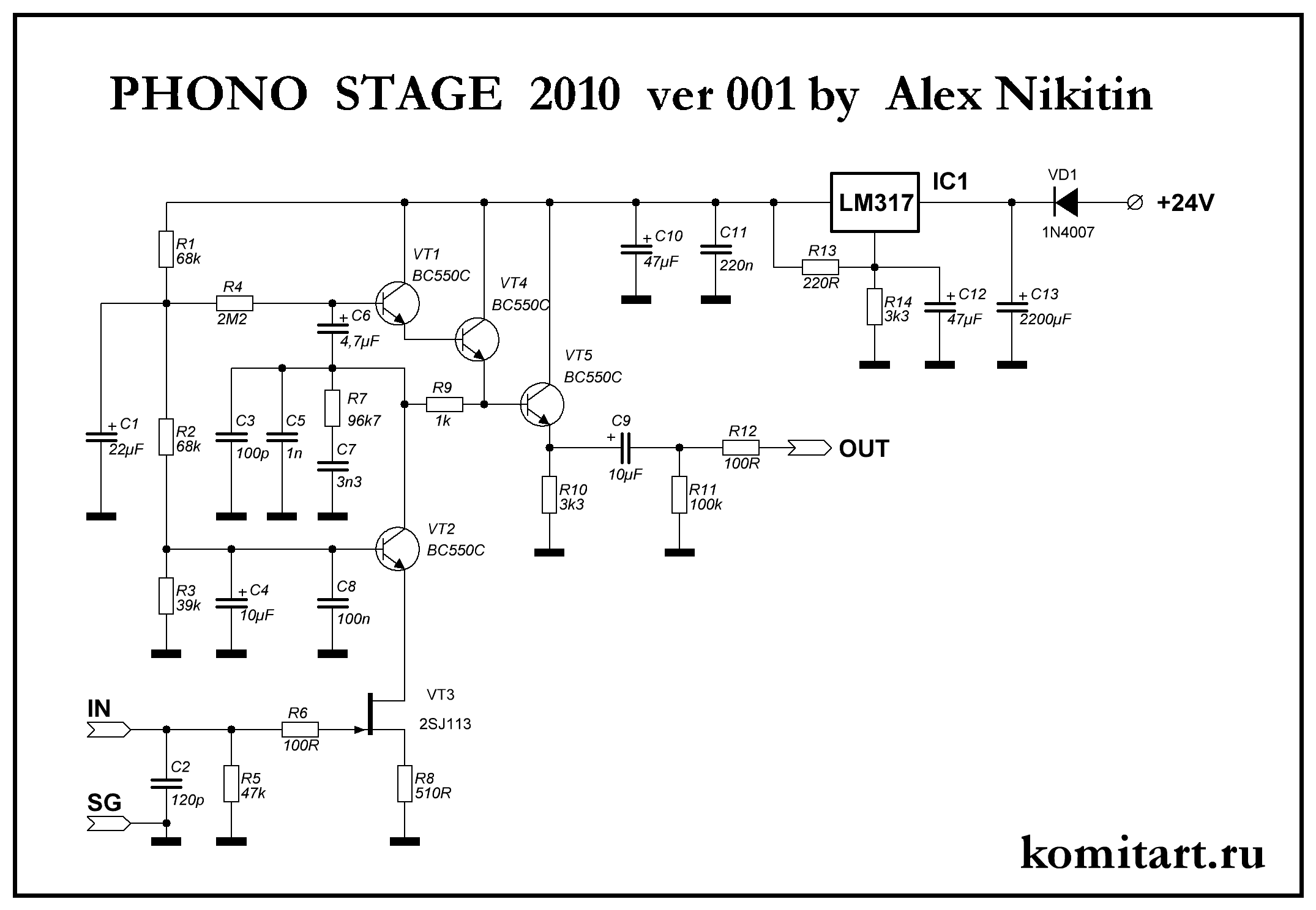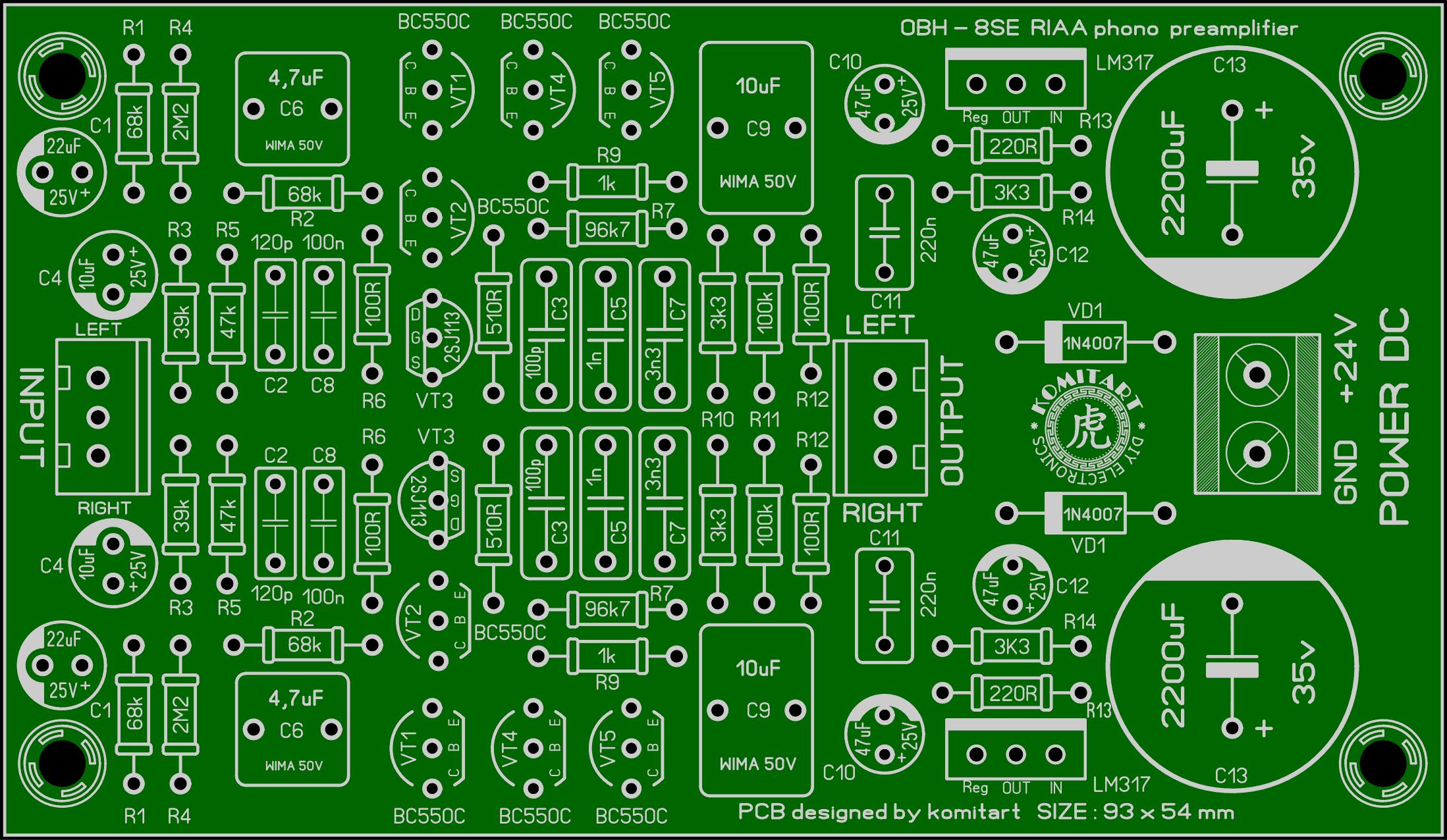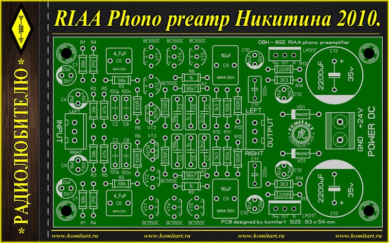 Приветствую, друзья. На форуме vegalab попалась на глаза ветка по фонокорректору Никитина 2010, прочитав пару страниц решил внести свою лепту в этот проект. Печатная плата конечно на форуме была, но, как говорится, без поллитра там хрен разберешься, там как минимум литр нужен, а я столько не выпью, и решил предложить свой вариант разводки, а заодно и перерисовать заново принципиальную схему. Сразу хочу обратить внимание, нумерацию элементов я проставил свою, и она не совпадает с нумерацией оригинальных схем с форума. Новую нумерацию элементов я так же проставил в слое шелкографии печатной платы. И так принципиальная схема: На форуме я вычитал предложения, что не плохо было бы добавить к преампу блок питания на LM317, а лучше свой блок питания на каждый канал, на плате эта хотелка реализована. Вместо электролитических емкостей на плате применены макросы неполярных конденсаторов типа WIMA, на качестве этих конденсаторов я бы экономить не советовал, ну или применить емкости типа Nichicon ES, в цепях коррекции лучше поставить FKP2. Радиаторы ставить на LM317 не нужно, при таком токе они будут совсем холодные. Плата в этом проекте односторонняя, размер получился 93 x 54 mm, компоновка элементов на плате симметричная, выглядит так: Список элементов: - IC1 - LM317 - 2 шт. - VT1, VT2, VT4, VT5 - BC550C - 8 шт. - VT3 - 2SJ113 - 2 шт. - VD1 - 1N4007 - 2 шт. - R1, R2 - 68k / 0,25W - 4 шт. - R3 - 39k / 0,25W - 2 шт. - R4 - 2M2 / 0,25W - 2 шт. - R5 - 47k / 0,25W - 2 шт. - R6, R12 - 100R / 0,25W - 4 шт. - R7 - 96k7 / 0,25W - 2 шт. (можно поставить 91k) - R8 - 510R / 0,25W - 2 шт. - R9 - 1k / 0,25W - 2 шт. - R10, R14 - 3k3 / 0,25W - 4 шт. - R11 - 100k / 0,25W - 2 шт. - R13 - 220R / 0,25W - 2 шт. - C1 - 22uF/25V - электролит - 2 шт. - C2 - 120p / 50V - 2 шт. - C3 - 100p / 50V - 2 шт. - C4 - 10uF/25V - электролит - 2 шт. - C5 - 1nF / 50V - 2 шт. - C6 - 4,7uF / 50V WIMA - 2 шт. - C7 - 3n3 / 50V - 2 шт. - C8 - 100nF / 50V - 2 шт. - C9 - 10uF / 50V WIMA - 2 шт. - C10, C12 - 47uF/25V - электролит - 2 шт. - C11 - 220nF / 50V - 2 шт. - C13 - 2200uF/35V - электролит - 2 шт. - Клеммник 2 Pin 5 mm (питание) - 1 шт. - Клеммник 3 Pin 2,54 mm (вход/выход) - 2 шт. Удачной сборки. Размер архива - 0,7 Mb.